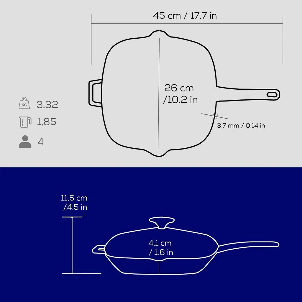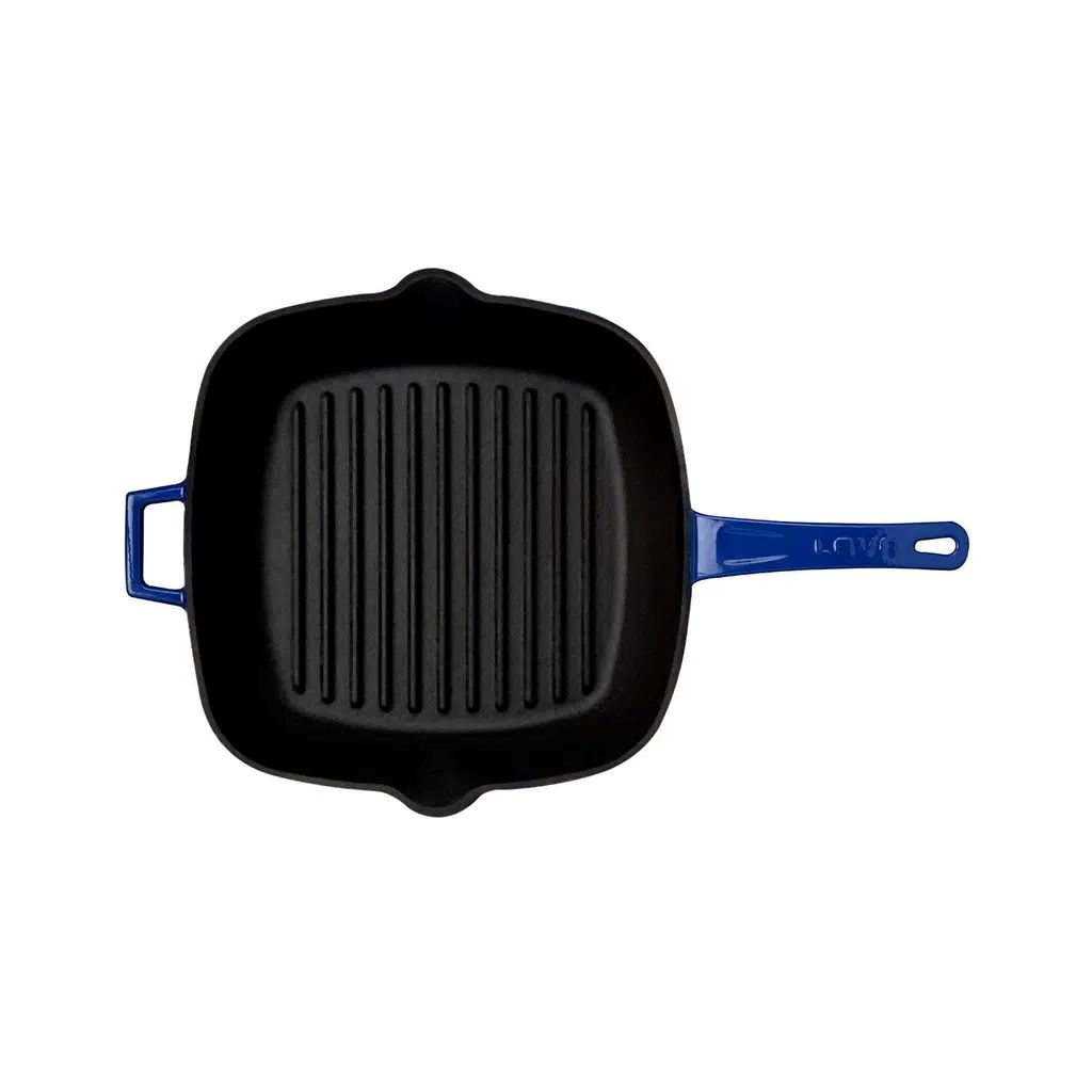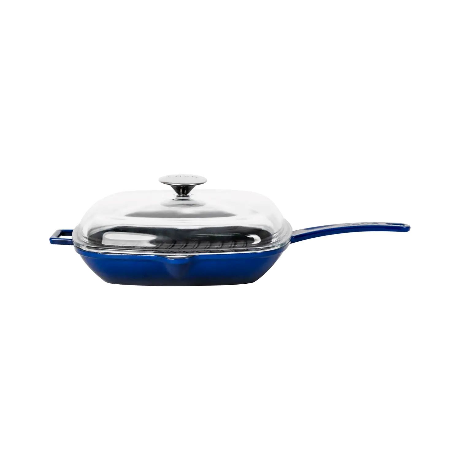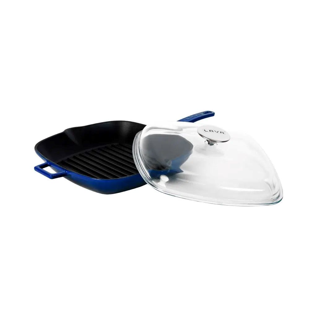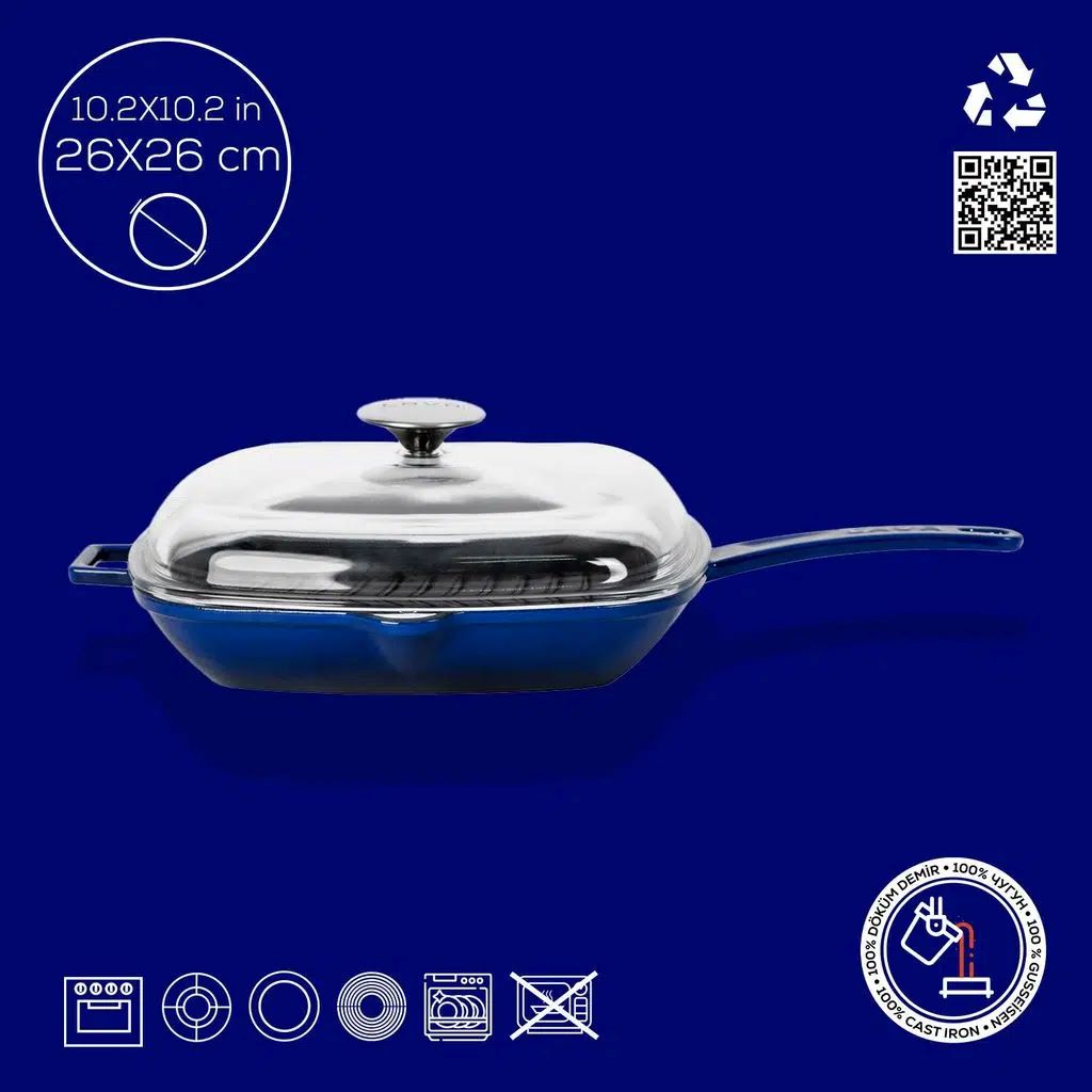 Tigaie grill patrata, marca Lava, dimensiuni 26 x 26 cm, fabricata din fonta. Este prevazuta cu un capac din sticla termorezistenta.