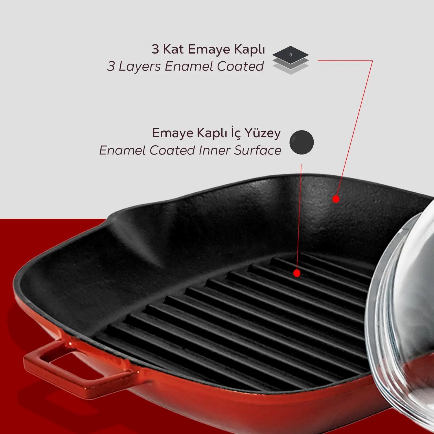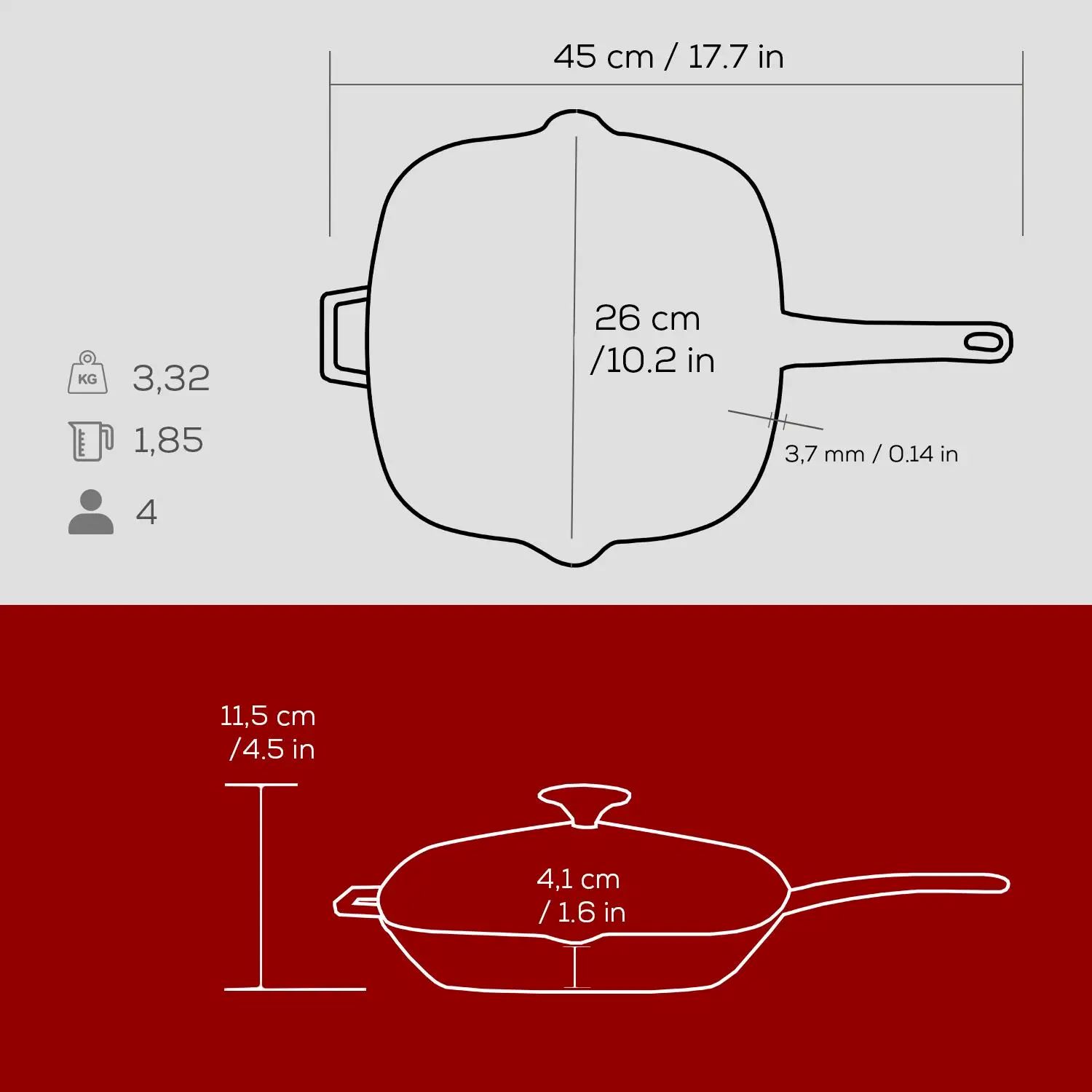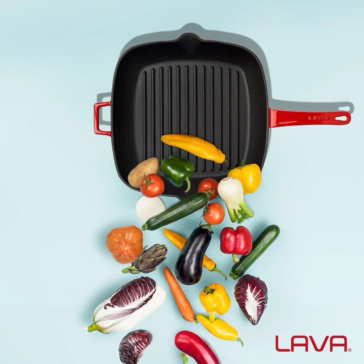 Tigaie Grill patrata, marca Lava, dimensiuni 26 x 26 cm, fabricata din fonta. Este prevazuta cu un capac din sticla termorezistenta.