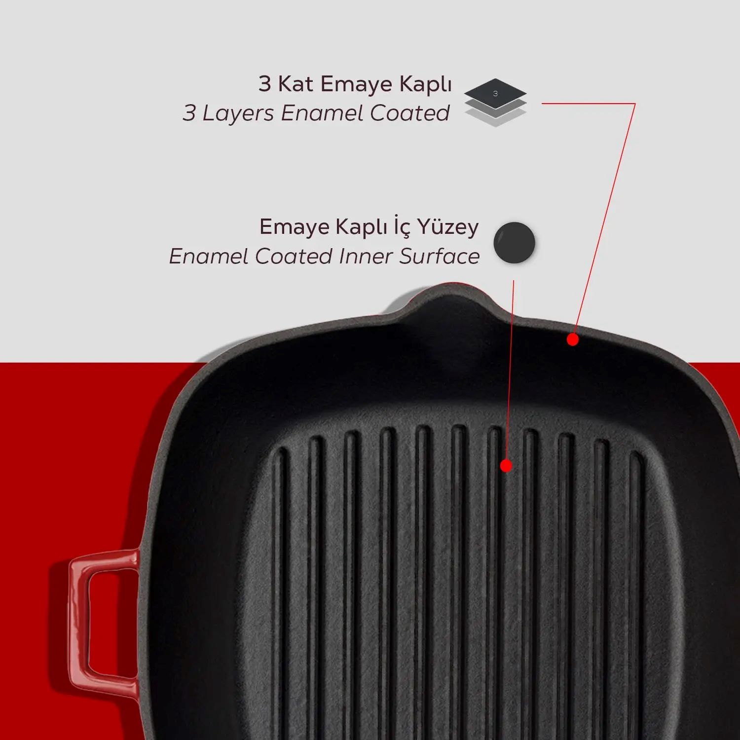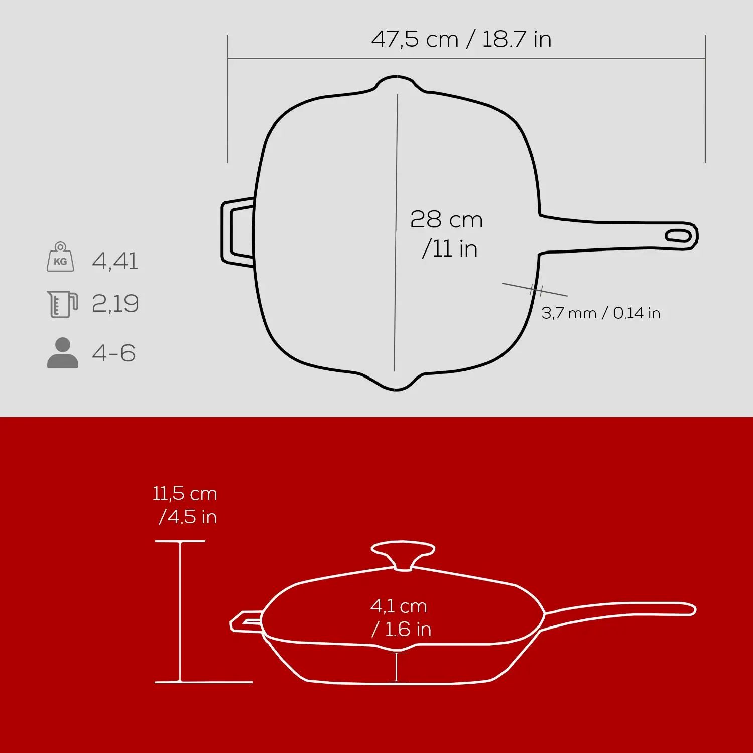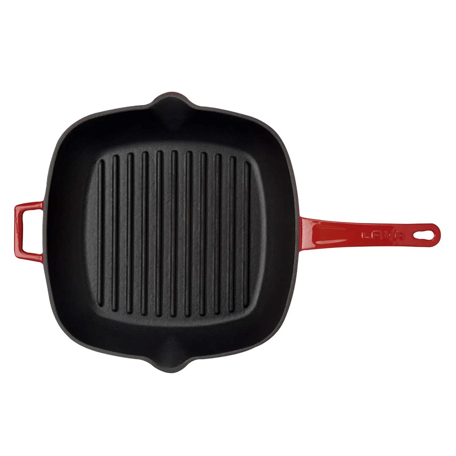 Tigaie grill patrata, marca Lava, dimensiuni 28 x 28 cm, fabricata din fonta. Este prevazuta cu un capac din sticla termorezistenta.