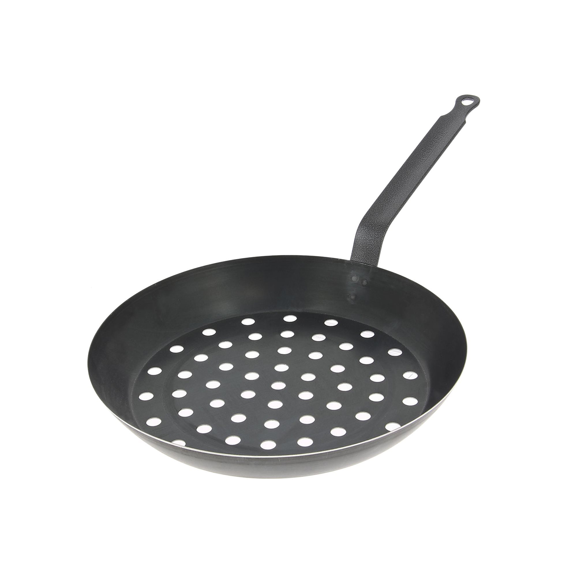 Tigaie pentru preparare castane din otel albastru, diametru 28 cm, marca de Buyer. Tigaia traditionala prezinta orificii, fiind special conceputa pentru gatitul castanelor pe carbuni fierbinti.