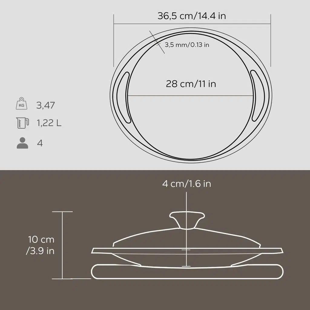 Peretii vasului au o grosime de 4 mm iar in interior, acesta prezinta un strat de email negru ce faciliteaza crearea unei suprafete anti-adezive atunci cand se gateste folosind grasimi.