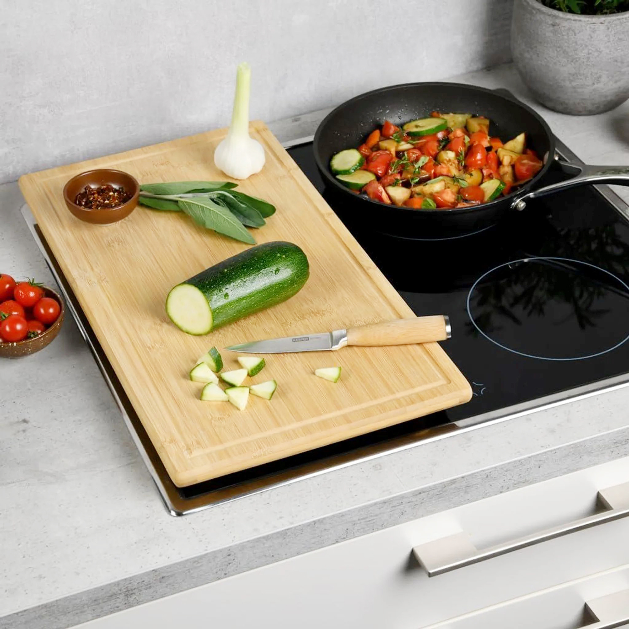 Versatil: fabricat din bambus robust – ideal ca tocator, extensie a suprafetei de lucru sau protectie pentru plite