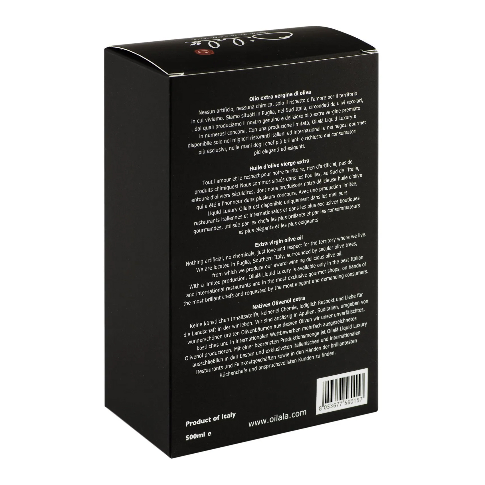 Linia noastră Liquid Luxury este dedicată celor care cred în legătura profundă dintre mâncare și iubire. Ambele, pentru a fi cu adevărat savurate, trebuie împărtășite cu cineva. Oilalà Liquid Luxury desăvârșește preparatele celor mai bune restaurante italiene și internaționale și îmbogățește rafturile celor mai exclusiviste magazine gourmet. Este alegerea perfectă pentru consumatorii eleganți și exigenți.