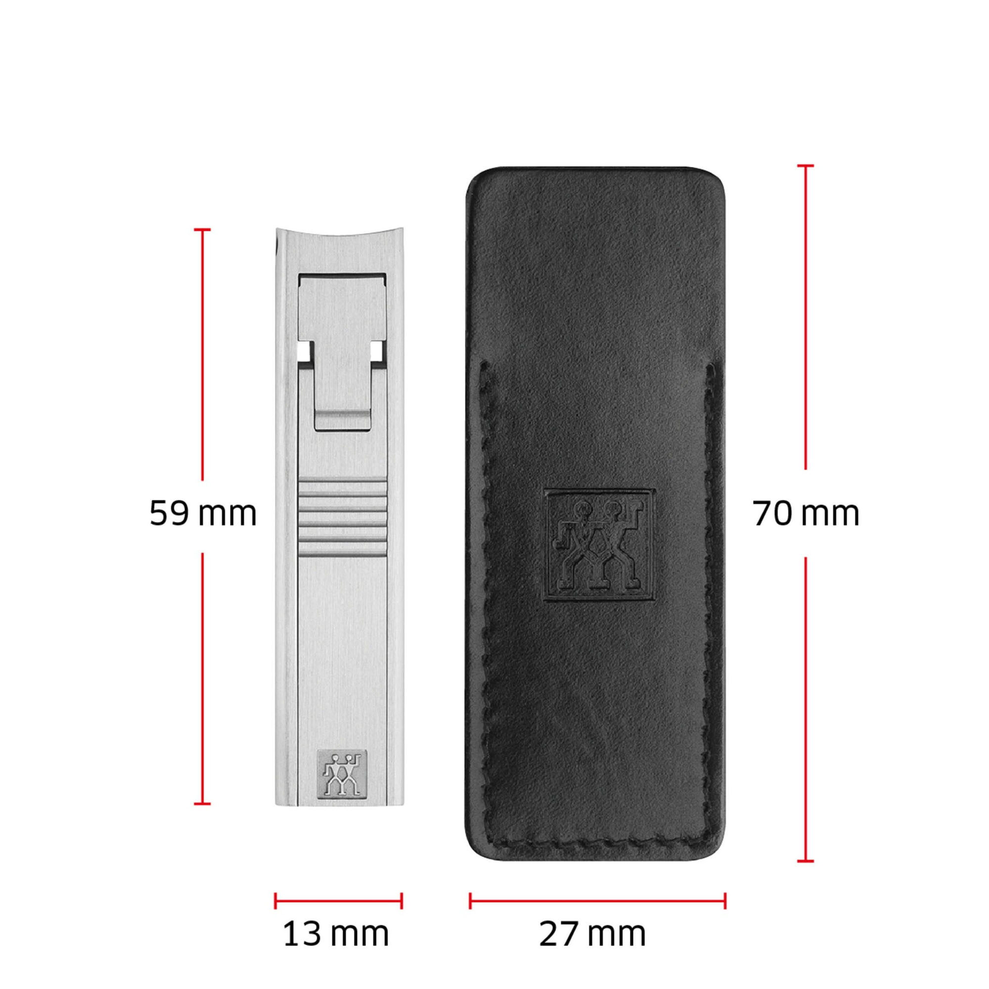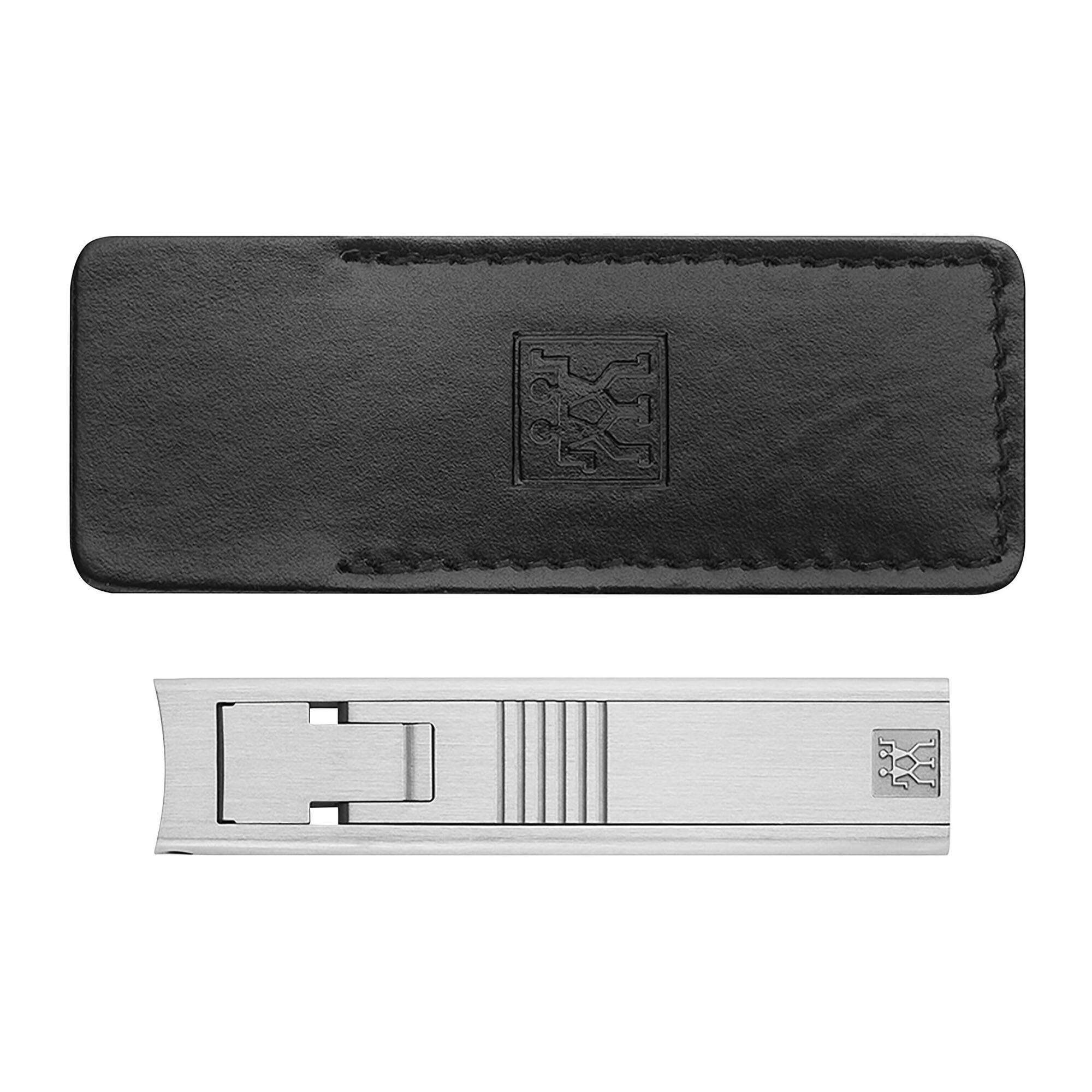 Unghiera compacta marca Zwilling, fabricata din inox mat, dotata cu o husa de protectie din piele.